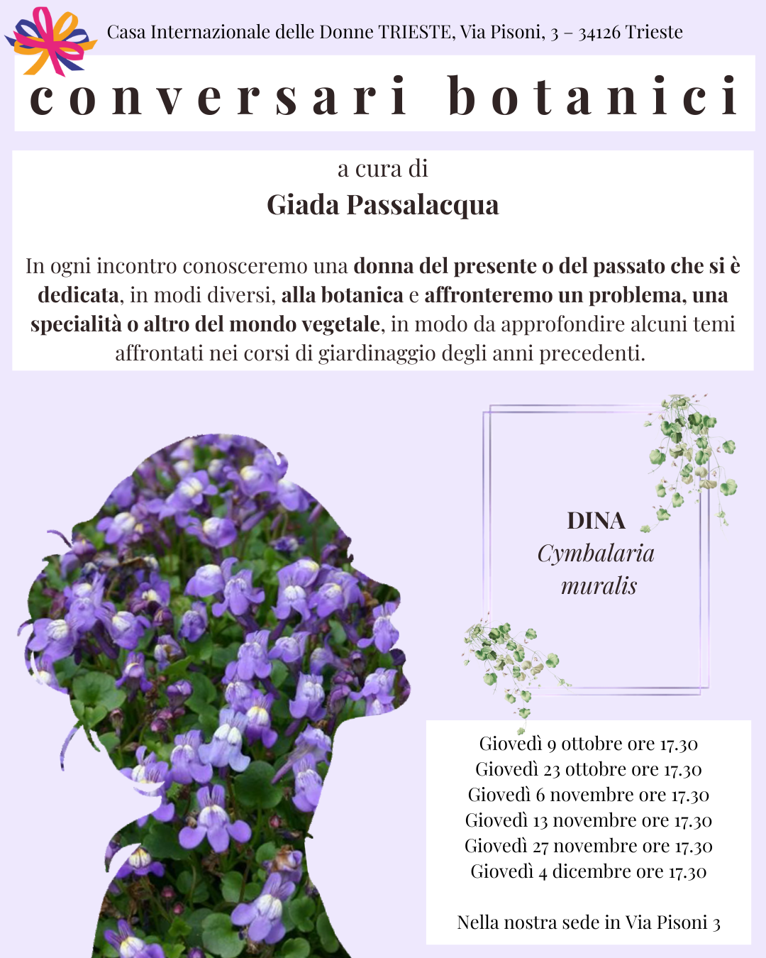 Vi invitiamo con grande entusiasmo a un ciclo di 6 incontri dal titolo Conversari botanici a cura di Giada Passalacqua, giardiniera, docente e artista. In ogni incontro conosceremo una donna del presente o del passato che si è dedicata, in modi diversi, alla botanica e affronteremo un problema, una specialità o altro del mondo vegetale, in modo da approfondire alcuni temi affrontati nei corsi di giardinaggio degli anni precedenti. Per partecipare è richiesta l’iscrizione alla Casa (15 euro).Â